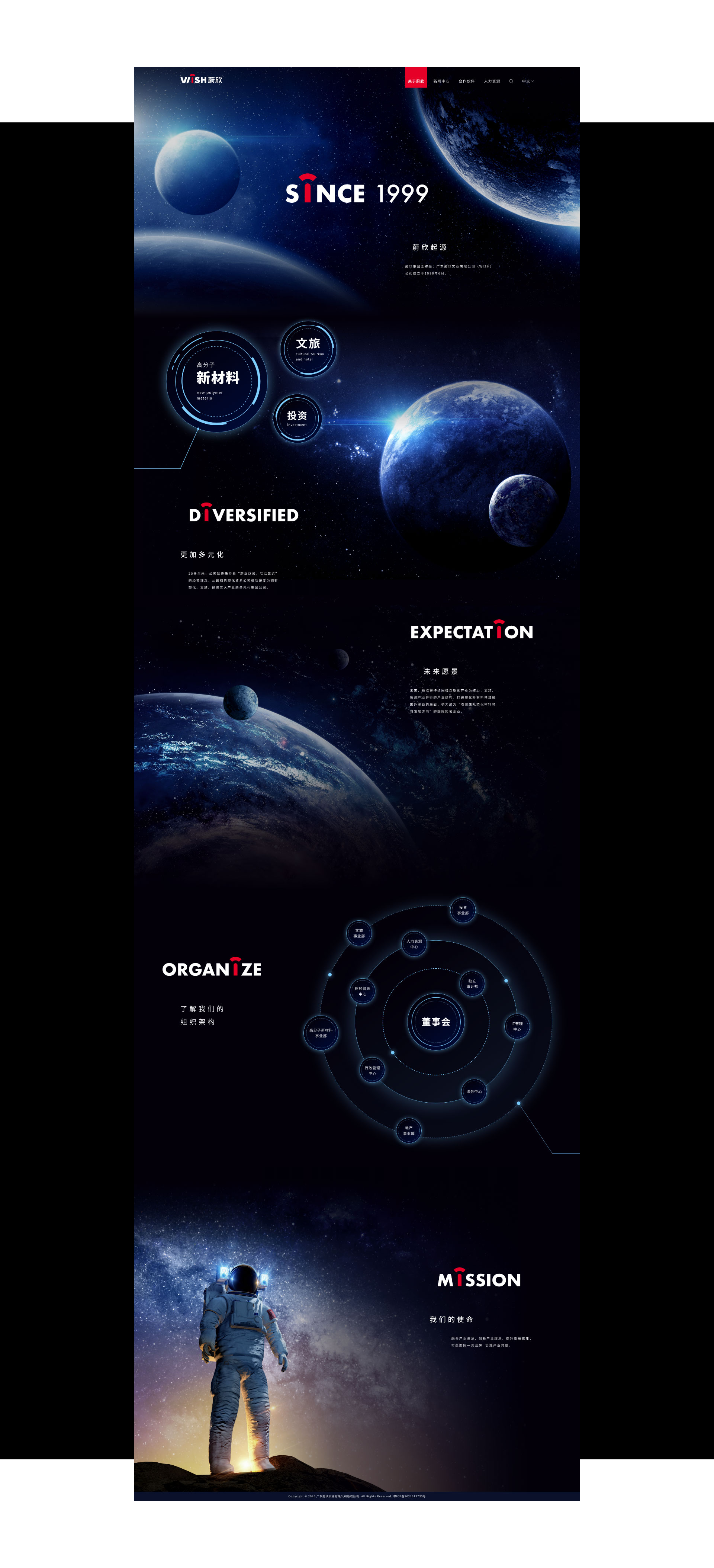 在此次蔚欣的设计中(zhōng),為(wèi)了體(tǐ)现其新(xīn)材料的未来科(kē)技(jì )感,运用(yòng)了太空题材的元素来刻画整个网站的设计底色与调性,并使用(yòng)了更多(duō)品牌化的创意元素使网站的视觉呈现更加个性。